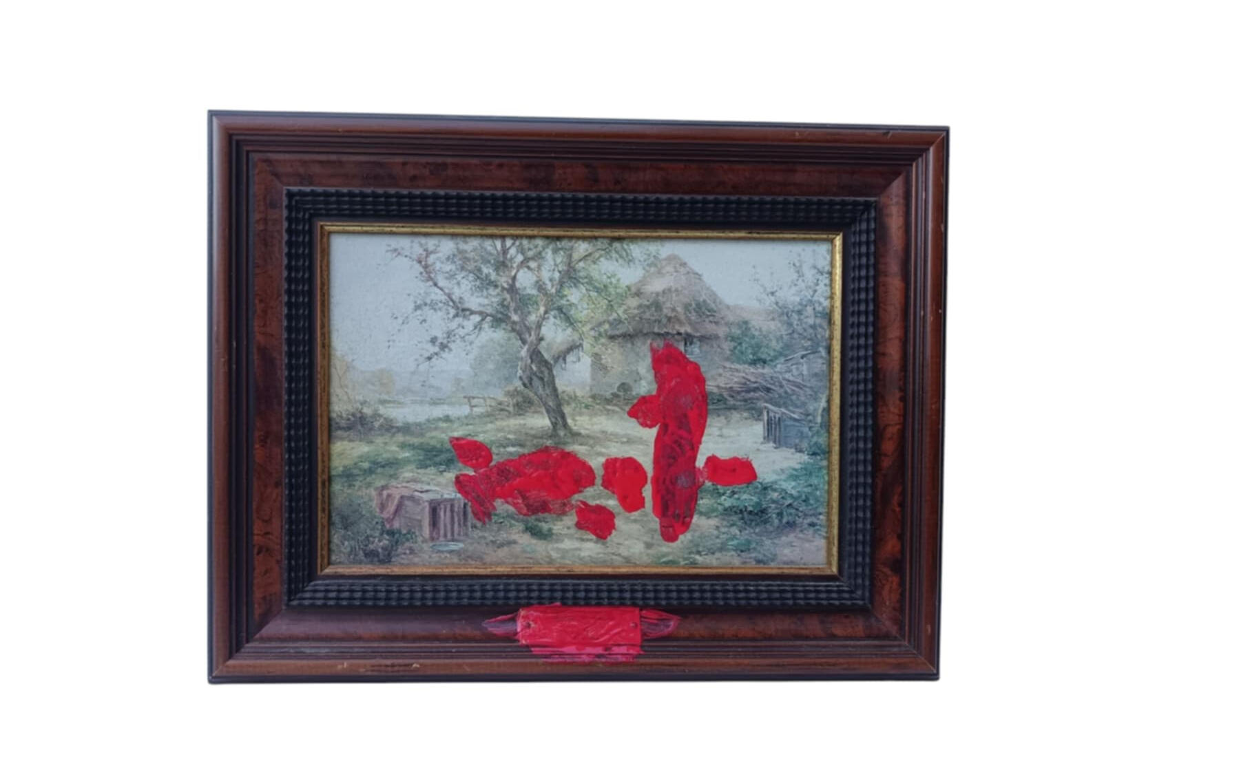 The ninth unit in an unstandardized series. A pastoral memory disrupted—violently assessed, then left to endure the record of its own failure. This piece questions the legitimacy of restoration, ownership, and permanence. Red is not emotion here. Red is data.