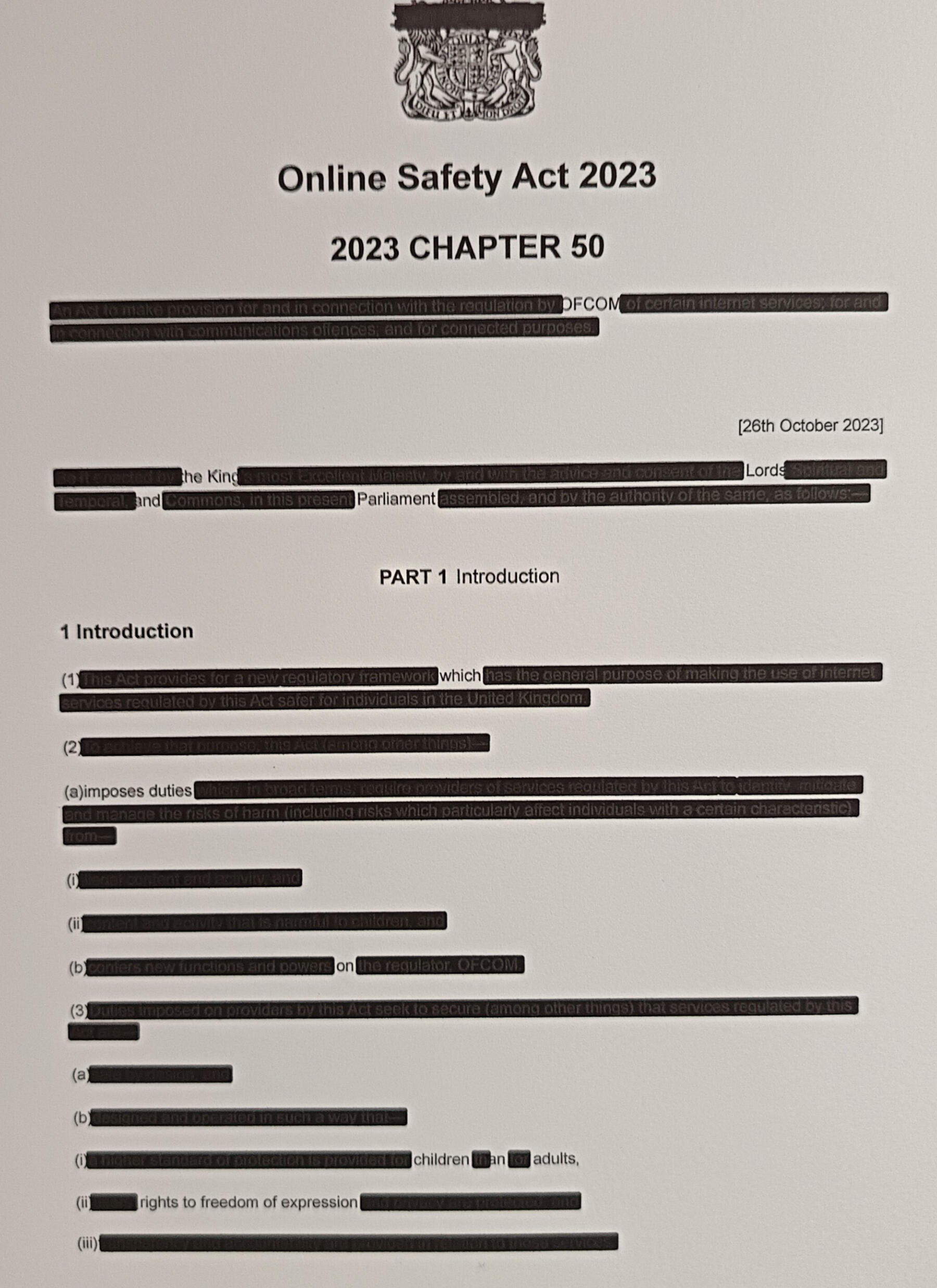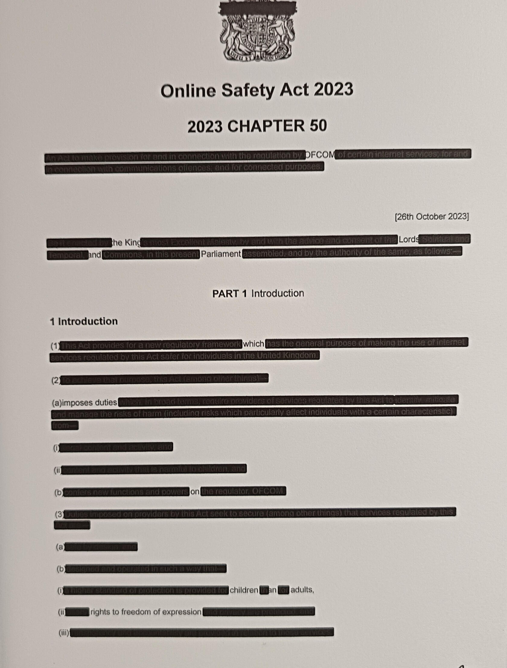 A PRINTED COPY OF THE ONLINE SAFETY ACT 2023 PARTIALLY OBSCURED THROUGH SYSTEMATIC