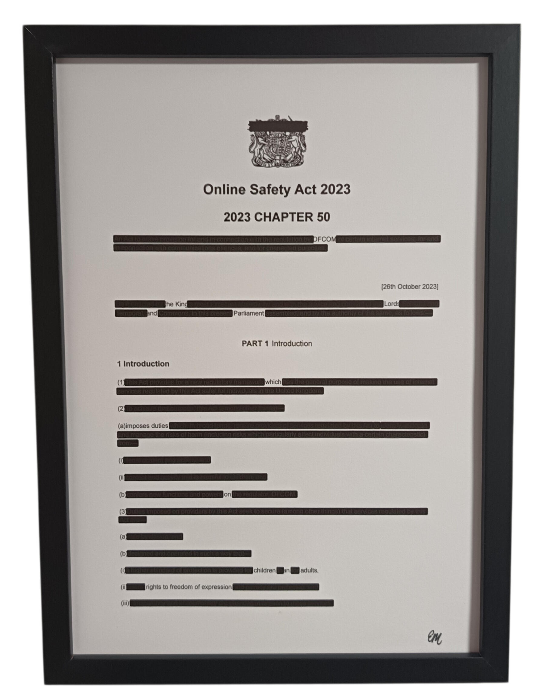 297 × 420 mmA printed copy of the Online Safety Act 2023 partially obscured through systematic redaction.